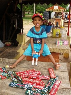 Helping mother on her stall selling water lilies and joss sticks etc to the pilgrims to Kataragama Temple