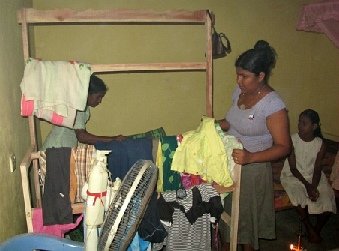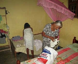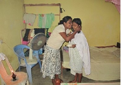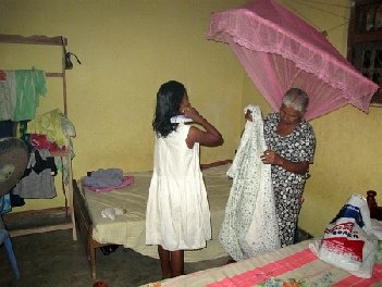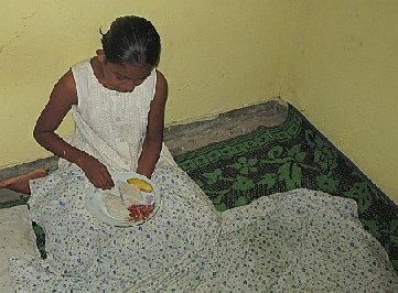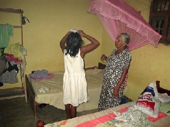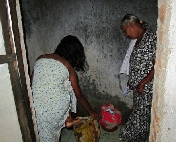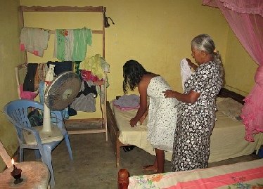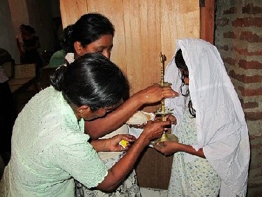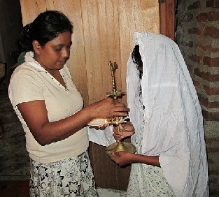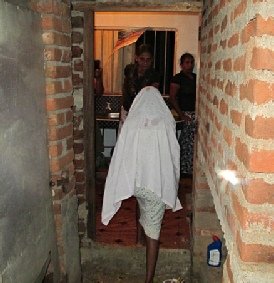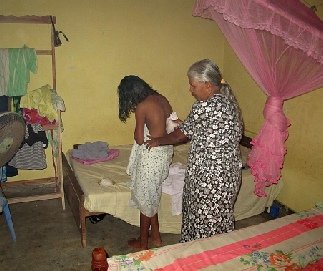 Dhobi woman helps girl to settle in in the room in which she will be secluded.