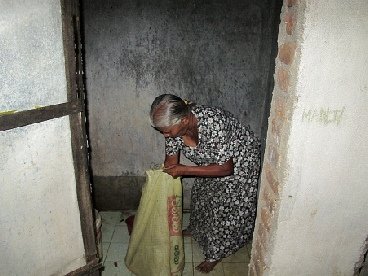 Dhobi woman finishes clearing up in the bathroom and collects up into a sack the girl’s clothes, sheets etc -