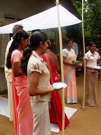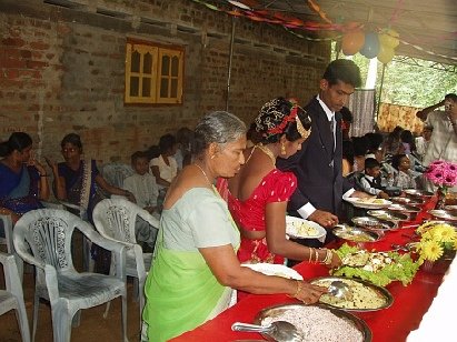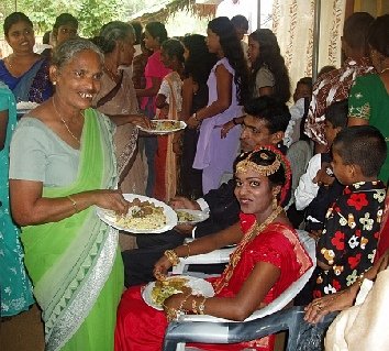 At the lucky time the bride eats her first meal at her new home. The couple serve themselves first from the buffet. The first mouthfuls they feed to each other