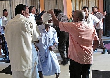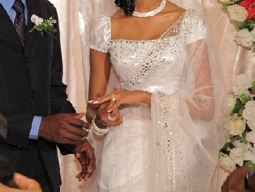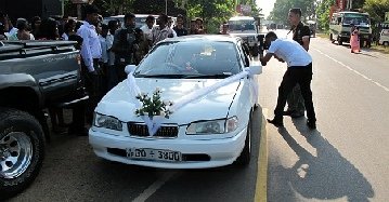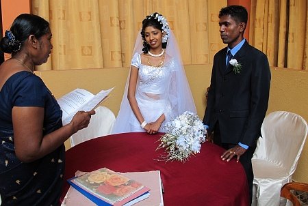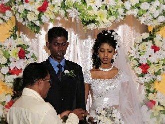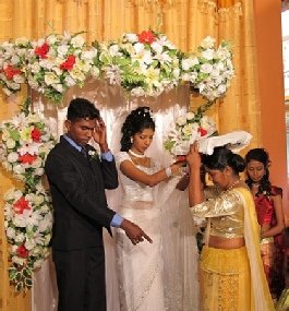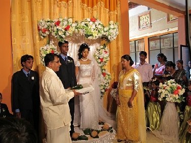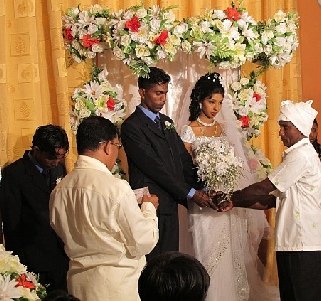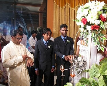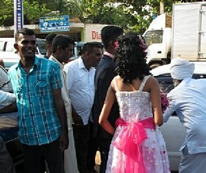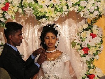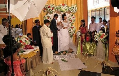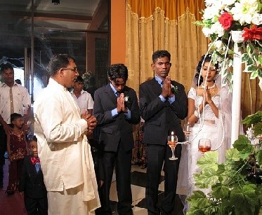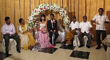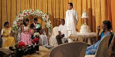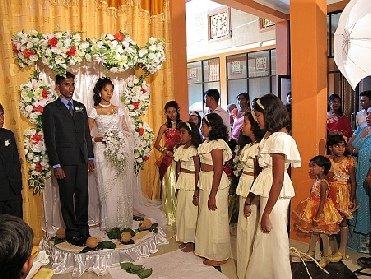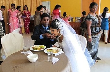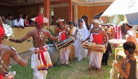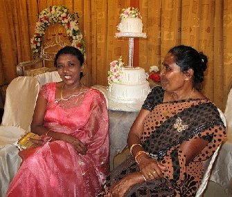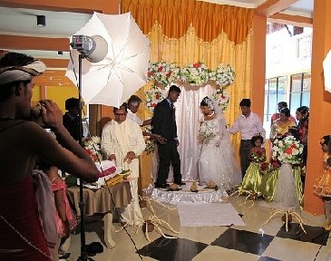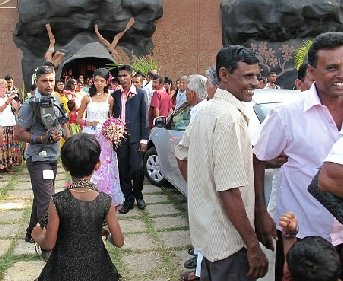 This white wedding is fairly typical of today’s weddings. It was held a a big hotel which provided all the catering etc. In fact it was arranged fairly quickly as the girl had a boyfriend of whom the parents did not approve so a matchmaker was consulted to organise an alternative. Here she is being led out by Kandy dancers to the wedding plinth. She had been “prepared” from the early hours - make-up, hair dressing etc.