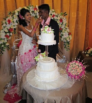In the meantime the couple have changed for the cutting of the wedding cake. They “feed” each other with the first slice. They then retire to the wedding bower
