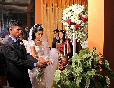 The couple then step down from the wedding platform and light the first wicks of their married life